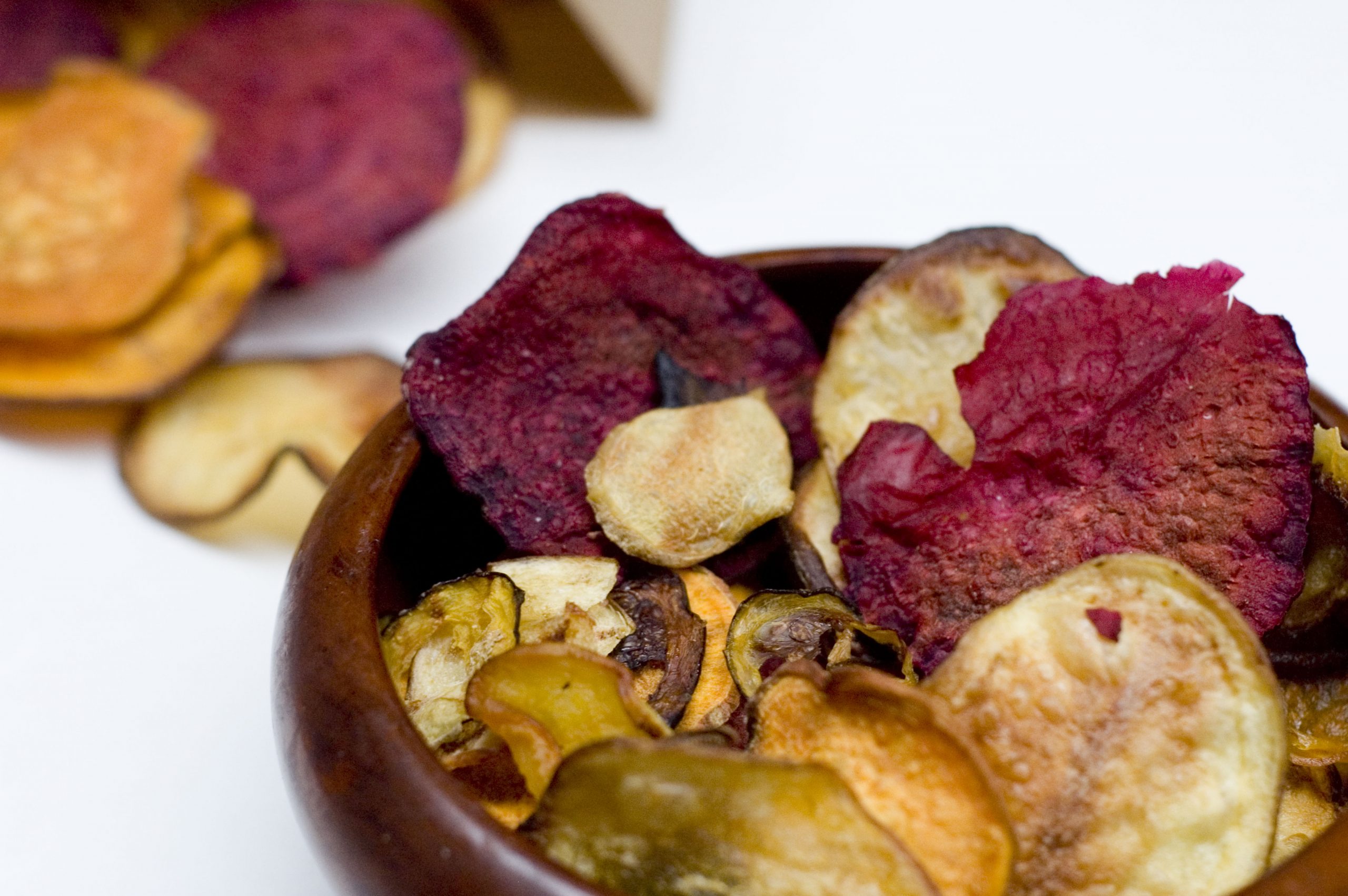 Vendido a granel nas lojas, o Veggie Chips é a aposentadoria dos snacks industrializados, é orgânico, feito a partir de lascas de vegetais in natura, cará, batata doce roxa, batata doce laranja (bio-fortificada pela Fundação Bill Gates), mandioca e mandioca com beterraba, além do visual lindo e colorido, é delicioso. Embora na tabela nutricional, as calorias sejam quase equivalentes, o Veggie Chips é rico em fibras, 6.05g, quase 5 vezes mais que os salgadinhos tradicionais e contém 10 vezes mais vitamina A do que a cenoura, por isso é uma excelente troca.